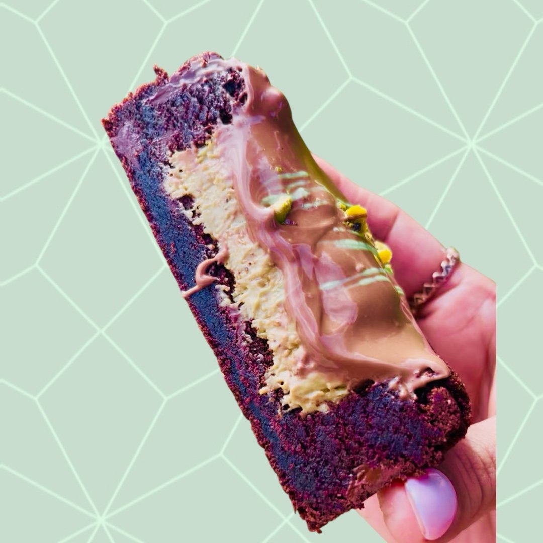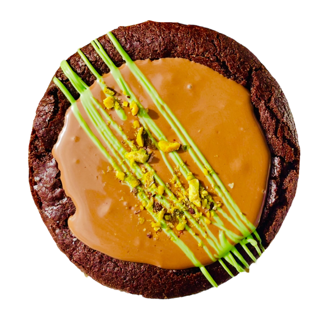 Galleta de Chocolate con trozos de chocolate milk, con relleno de centro de caitaifi, crema de pistachio y ganache de chocolate milk, arriba tiene un decoración de crema de pistachio y trazos de pistacho.
