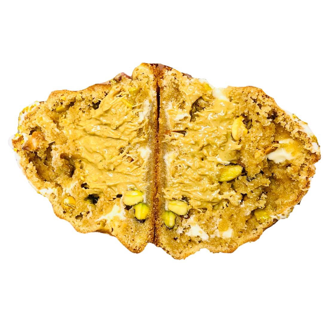 Galleta de vainilla con trozos de chocolate blanco, pistachios tostados, kataifi con crema de pistachio y tahini.
